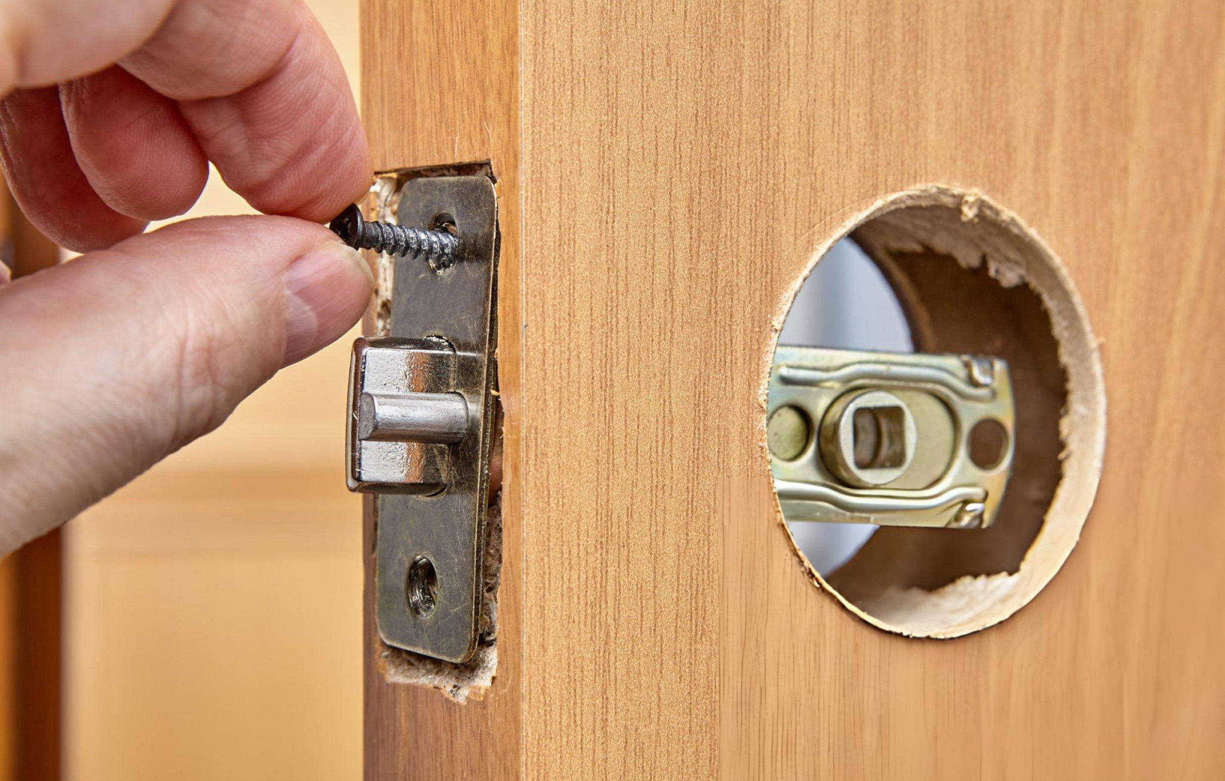 Heavy-duty strike plate, 3″ screws into studs, and latch alignment for kick-in resistance.